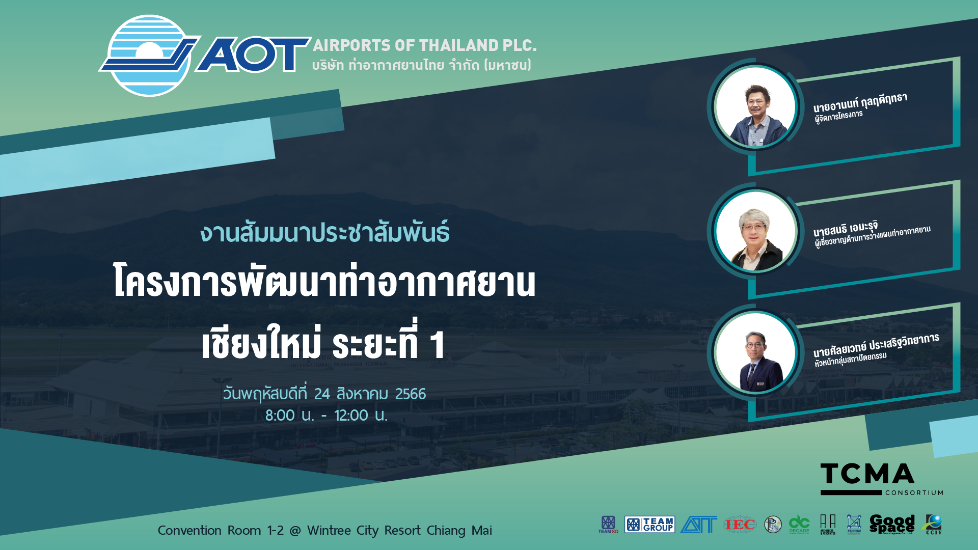 บริษัท ท่าอากาศยานไทย จำกัด (มหาชน) และกลุ่มบริษัทที่ปรึกษา ที.ซี.เอ็ม.เอ ได้ตระหนักถึงความสำคัญของผลกระทบที่อาจจะส่งผลต่อหน่วยงานผู้มีส่วนได้ส่วนเสียของโครงการ จึงได้จัดการสัมมนาประชาสัมพันธ์โครงการ ครั้งที่ 1 ในวันพฤหัสบดีที่ 24 สิงหาคม พ.ศ.2566 เวลา 08.30 - 12.00 น. ณ ห้องประชุมคอนเวนชั่น 1-2 โรงแรมวินทรี ซิตี้ รีสอร์ท เชียงใหม่